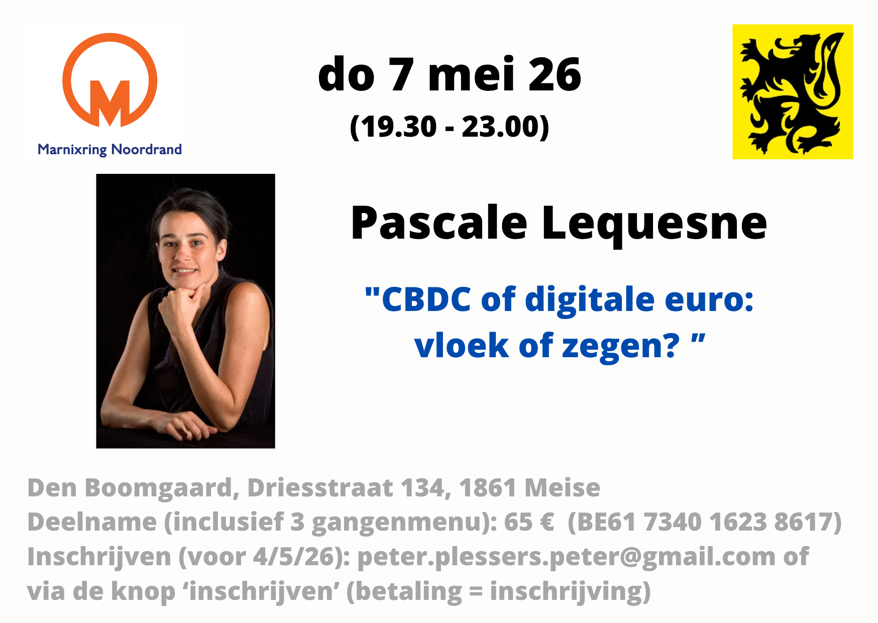 We nodigen jullie graag uit voor onze volgende vergadering die zal plaatsvinden op donderdag 7 mei 2026, vanaf 19.30 uur met als gastspreker Pascale Lequesne met als titel CBDC of digitale euro: vloek of zegen?.